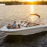 Vantage will surprise you. It’s a boat designed to meet the needs of the widest possible range of boaters—from fun-loving families to hardcore anglers. A dual console cockpit with wraparound windshield provides functional comfort for passengers. Comfortable seating in the bow, cockpit and stern allows for family-sized crews to relax all day. And roomy storage throughout the boat means you can load in all the gear you need for any type of adventure on the water. At a mere 21 feet, it’s easily trailerable, but 250 horsepower on the transom means you can get up and go when you’re ready to ride.