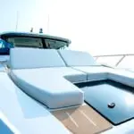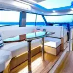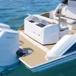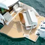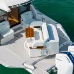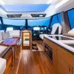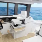 Featuring a salon social zone with versatile seating, the helm seat rotates inward while the companion seat adjusts to form a comfortable L-shaped lounge, ideal for entertaining. The aft cockpit offers a customizable experience, featuring your choice of the Buffet Lounge or the Adventure modules. The aft facing cockpit seat with storage complements either module.