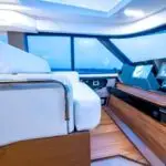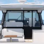 A glass enclosure with sliding glass door and electrically actuated glass window open seamlessly to the cockpit, complete with a fold-down hullside terrace. Choose between the Buffet Lounge or Adventure Module to tailor the cockpit to your boating preferences. The rotating Buffet Lounge features a high-gloss table, electric grill and countertop, while the Adventure Module includes fold-down lounge seating, a coil-wrapped freezer tank, livewell and other fishing amenities needed for a memorable day on the water.