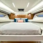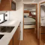 The galley is thoughtfully positioned below to enhance the social space above deck. Outfitted with a sink, microwave, cooktop, and premium amenities, the space is designed to support effortless entertaining. Two well-appointed sleeping quarters offer comfort on longer cruises and a three-zone head complete the space.